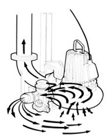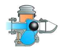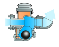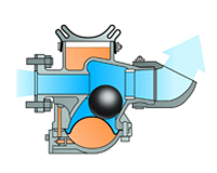 Когда насос стартует и начинается перекачка, клапан открыт. Вода из насоса проходит через клапан в виде мощной промывочной струи. Эта струя, проходя через клапан, создает в камере шара разряжение (область пониженного давления).