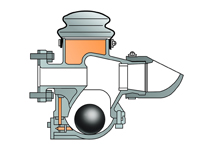 При подъеме на критическую высоту, шар подхватывается потоком и прижимается к выходному отверстию, перекрывая поток и закрывая клапан. При этом насос начинает работать на напорный трубопровод. Повышение давления в клапане действует на мембрану, переводя ее обратно в исходное положение.